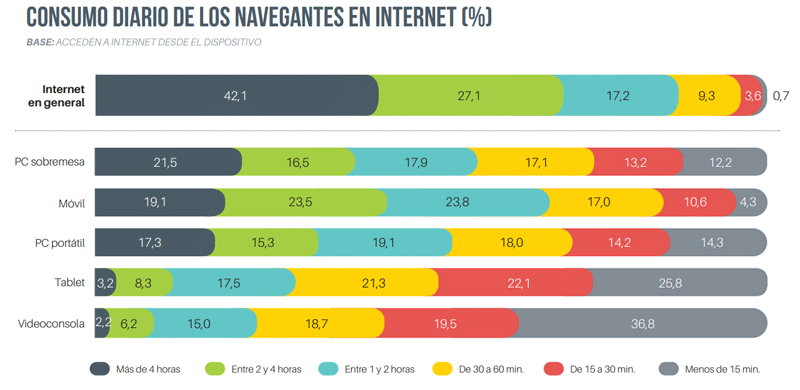 El tiempo promedio que se pasa conectado a internet, de manera activa, son 4 horas al día, lo que supone una razonable disminución respecto a 2020. En pandemia eran 12 minutos más. La respuesta más repetida es entre dos y cuatro horas (27,1%), pero hay un 26,1% que declara entre cuatro y ocho horas diarias y un 16% que dice sobrepasar esas ocho horas.