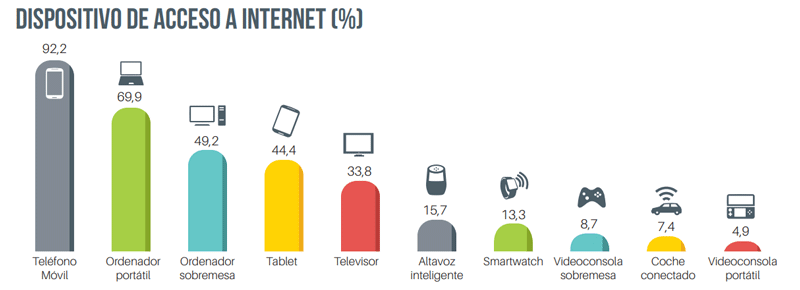 En lo que si se manifiesta la solidez de la evolución digital es en los asuntos más cotidianos. La conectividad, como primer dato: un 92,2% accede a internet a través del móvil. El 69,9% usa el portátil y el 49,2%, ordenador de sobremesa. Hay dos dispositivos que crecen, el altavoz inteligente (lo usa un 15,7%) y el coche conectado (7,4%).