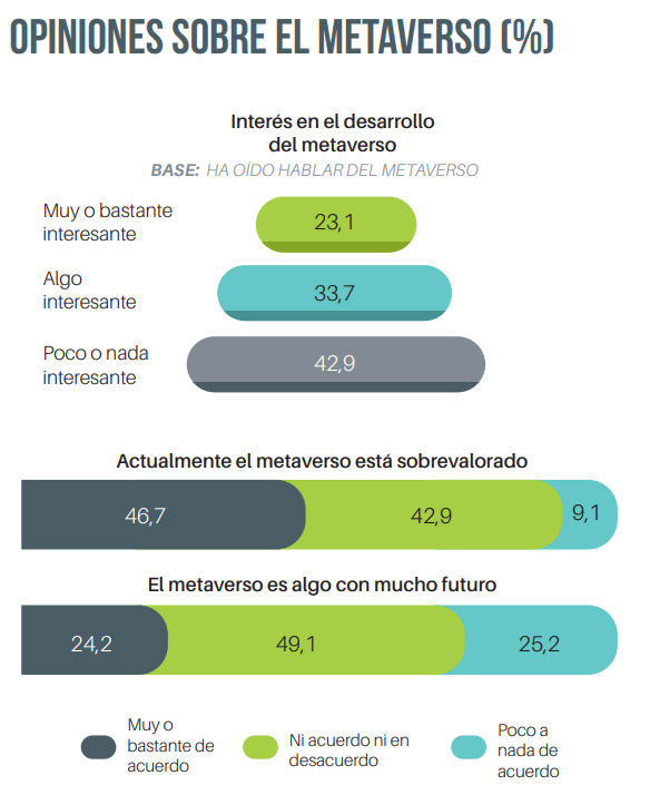 Tampoco el metaverso responde a las fantasías de su promoción a bombo y platillo. El 82,7% ha oído hablar de él, pero sólo la mitad (el 42% del total) sabe lo que es. Apenas despierta interés en el 23,1% y el 42,9% está poco o nada interesado. Apenas el 25,2% le ve algún futuro. Y de los que han tenido noticia sobre el metaverso, el 13,5% dice haber accedido a alguno de los que existen. La mayoría relacionada con juegos: Fortnite (6,3%), Mincraft (6,2%) y Roblox (3,3%), los más destacados.