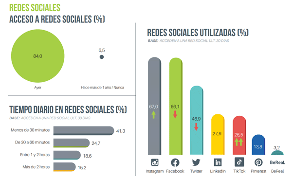 Las redes sociales registran un cambio de liderato: Instagram (67%) desbanca a su propietario Facebook (66,1%). Les sigue Twitter (46,9%), aunque lo más destacado es el empujón de TikTok, que entró en la lista en 2020 con el 13,3% y en 2022 ya está en el 26,5%. Un crecimiento que queda a expensas de las vicisitudes políticas, una vez que muchos gobiernos occidentales están decidiendo vetar a la aplicación china, quizás como preámbulo de su absoluta prohibición bajo sospecha de espionaje.