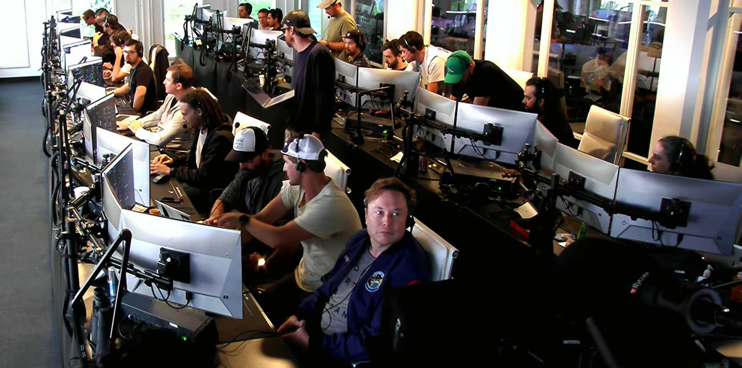 «Honestamente, ¡qué mañana tan emocionante! Hemos visto un exitoso despegue…», dice entre risas (tal vez nerviosas) la comentarista del lanzamiento, a sueldo de SpaceX, mientras una multitud de empleados se apretuja y berrea entusiasmada con los puños en alto en un enorme hangar decorado con toberas de cohetes.