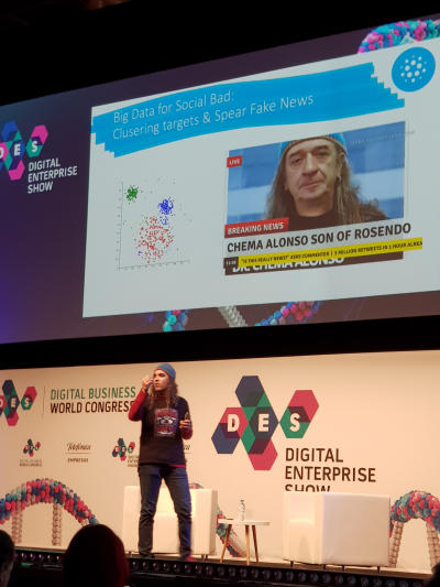 Primera jornada del Digital Enterprise Show en Madrid, la que pretende ser gran referencia de la empresa digital en ESpaña, que este año muestra una gran asistencia, con un ritmo frenético y media docena de espacios para conferencias en sesión continua. Entre los invitados estelares, el atávico e inevitable CDO de Telefónica (patrocinadora) Chema Alonso, con su gorro, se empeñó en explicar en primera persona de qué va el momento actual de la inteligencia artificial, negándose a admitir que el rockero Rosendo sea su padre, aunque la IA los vea tan igualitos. En fin...