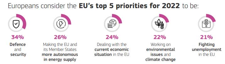 Un Eurobarómetro recién publicado muestra que los ciudadanos europeos apoyan masivamente una política común de seguridad y defensa y esperan que la UE elimine gradualmente su dependencia de las fuentes de energía rusas. La encuesta también confirma el amplio apoyo a la respuesta de la UE a la agresión rusa contra Ucrania. (Más detalles en nota de prensa)