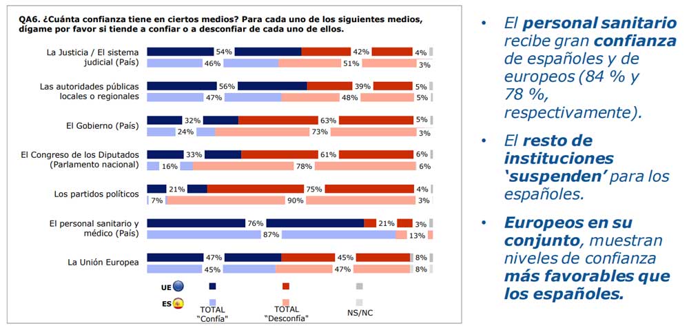Tres de cada cuatro españoles están a favor de que se tomen más decisiones a nivel de la UE. La inflación es el primer problema al que se enfrenta España, según las opiniones recogidas por el Eurobarómetro, seguido de la situación económica. Y los datos de confianza en las instituciones son muy poco halagüeños para el Gobierno (24%), Parlamento (16%) y partidos políticos (7%). Este partido no lo arbitra Tezanos. Apenas se salvan un poco las autoridades locales (47%) (Más detalles en nota de prensa)
