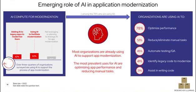 Un estudio sobre el estado de la modernización de aplicaciones elaborado por Red Hat y comentado por su 'Technology Advocate', Gordon Haff, descubre que, de las empresas encuestadas, el 42% opta por añadir inteligencia artificial a sus aplicaciones heredadas para modernizarlas.(Más detalles en nota de prensa)