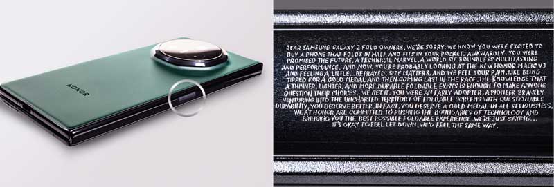 La china Honor presume de haber producido el móvil plegable 'más fino del mundo', que sólo mide 4,35 milímetros cuando está desplegado y 9,2 cuando está plegado según los datos del fabricante, que para subrayarlo ha grabado una 'disculpa humorística' en el estrecho margen que le deja la bisagra (véase foto) a los otras marcas que ofrecen plegables. (Más detalles en nota de prensa)