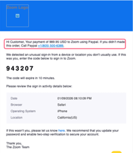 Check Point descubre una sofisticada campaña de phishing que utiliza de forma malintencionada plataformas SaaS (Software-as-a-Service) legítimas para estafas telefónicas de alta credibilidad, con más de 130.000 correos que han afectado a más de 20.000 empresas a nivel mundial. Microsoft, Zoom, Amazon, PayPal, YouTube y Malwarebytes han sido objeto de abuso o suplantación. (Más detalles en nota de prensa)