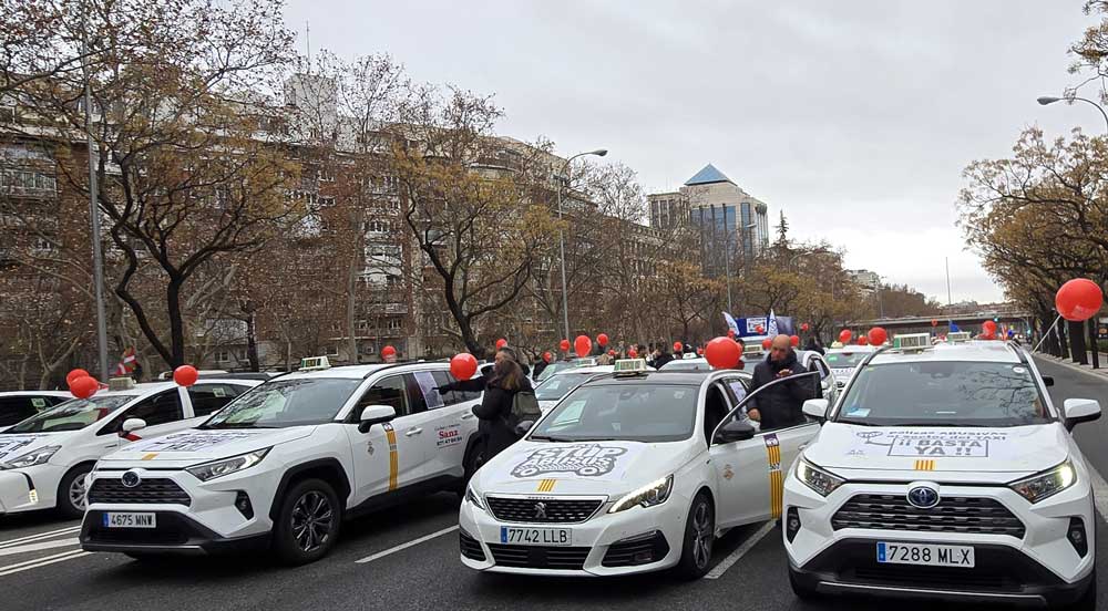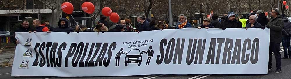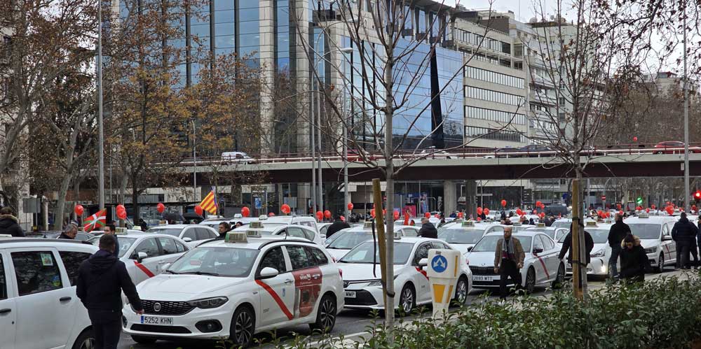 Se quejan, los taxistas, de los precios que les imponen los seguros. “Hasta 7.000 euros al año” grita la pancarta puesta al frente, ante una relajada barrera policial, a pocos metros del caos de grandes obras que flanquean el renovado estadio Bernabéu.