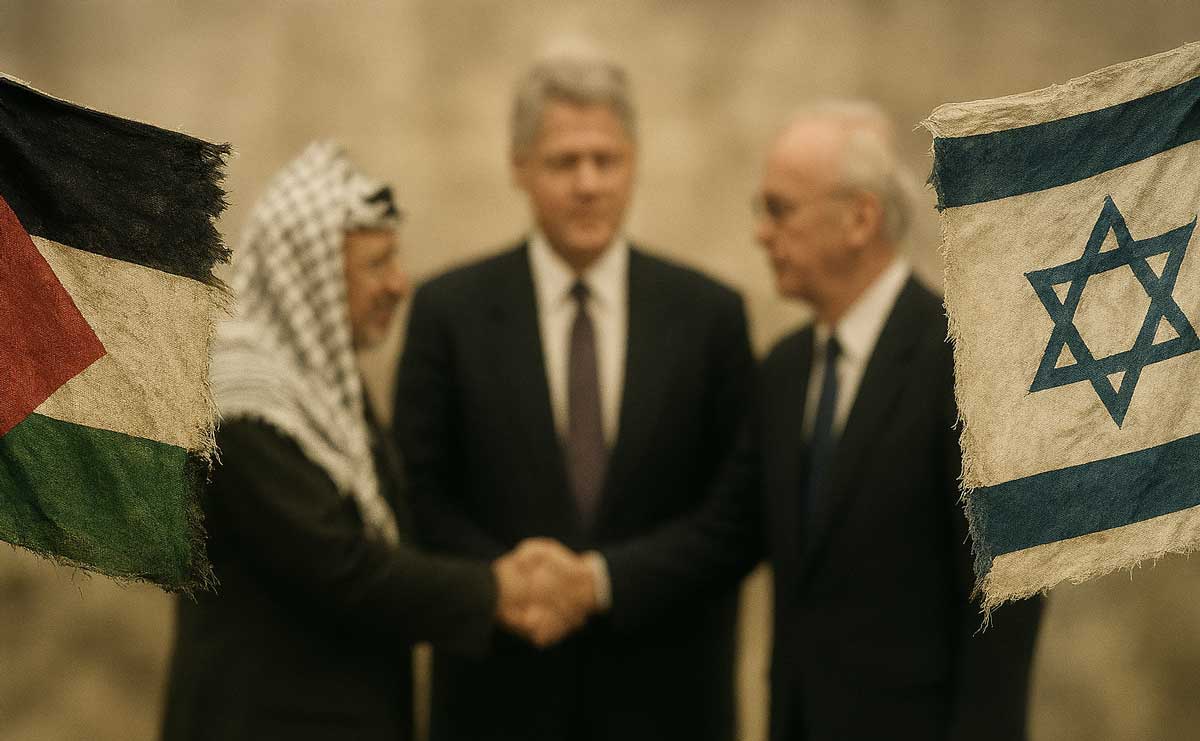 Ilustración basada en la histórica foto de los acuerdos de Oslo, en 1993, con Arafat, Clinton y Rabin. Creada con IA generativa Copilot.